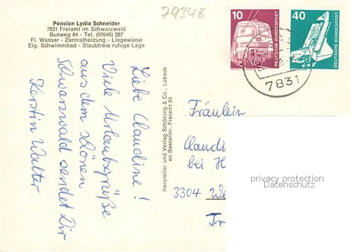 73852982 Freiamt_Emmendingen_BW Pension Lydia Schneider Gastraum Gartenterrasse Schwimmbad postalisch gelaufen nach 1965 Erhaltung siehe scans [WerneD78] [WernPID7 ]