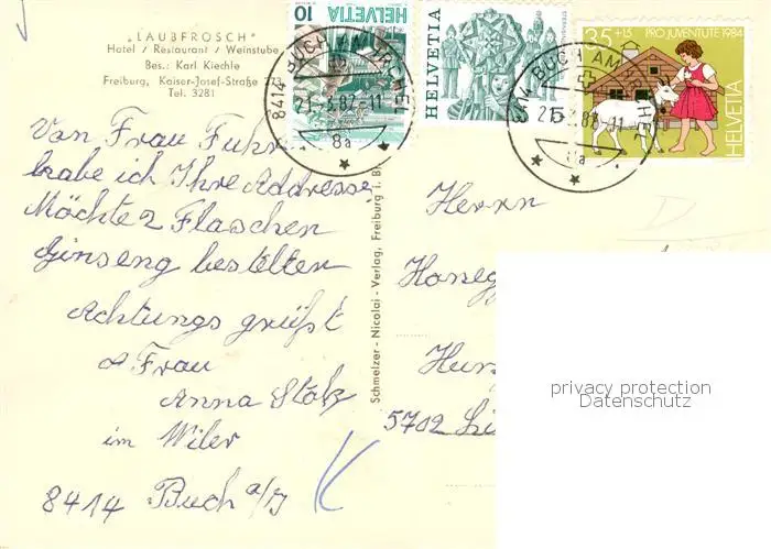 73853532 Freiburg_Breisgau Hotel Restaurant Weinstube Laubfrosch Freiburg Breisgau postalisch gelaufen 1987 Erhaltung siehe scans [FriedD77] [Frierer ]