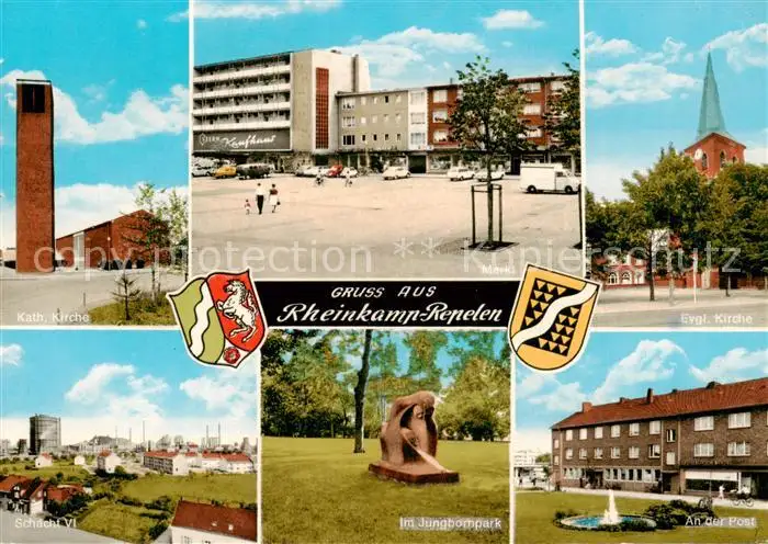 AK / Ansichtskarte 73854061 Rheinkamp_Repelen_Moers_Moers Kath Kirche Markt Ev Kirche Schacht VI Jungbornpark An der Post