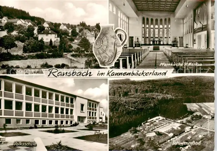 73854231 Ransbach-Baumbach Pfarrkirche St Markus Volksschule Schwimmbad Ransbach-Baumbach postalisch nicht gelaufen nach 1965 Erhaltung siehe scans [WerneD78] [WernPID7 ]