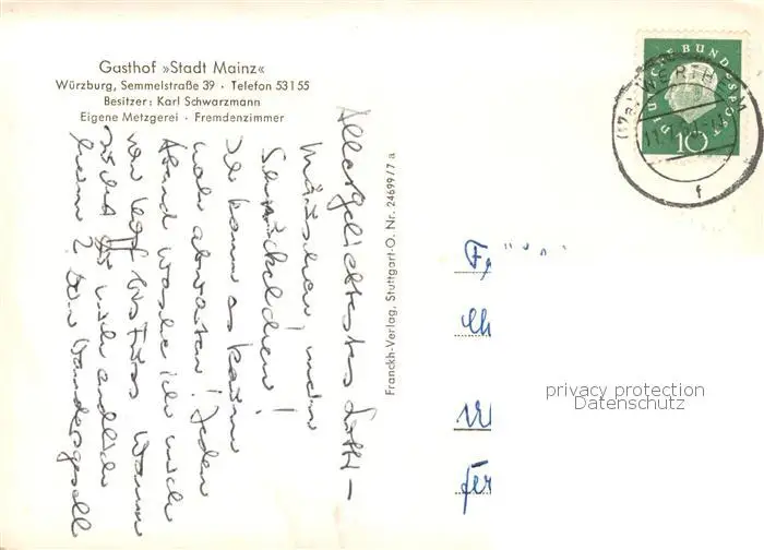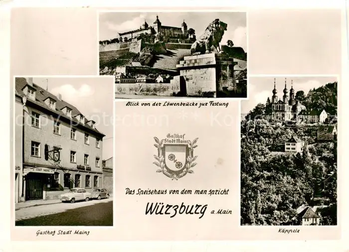 73854629 Wuerzburg Gasthof Stadt Mainz Blick von der Loewenbruecke zur Festung Kaeppele Wuerzburg postalisch gelaufen 1959 Erhaltung siehe scans [WerneD78] [WernPID7 ]