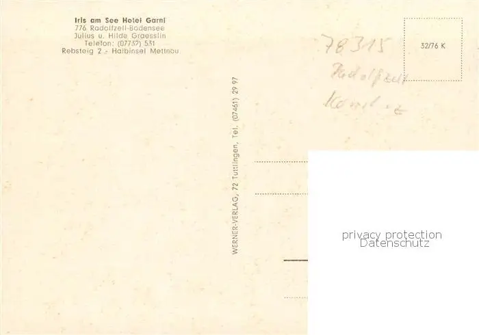 73854664 Radolfzell_Bodensee Hotel Garni Iris am See Radolfzell Bodensee postalisch nicht gelaufen nach 1965 Erhaltung siehe scans [FriedD77] [Frierer ]