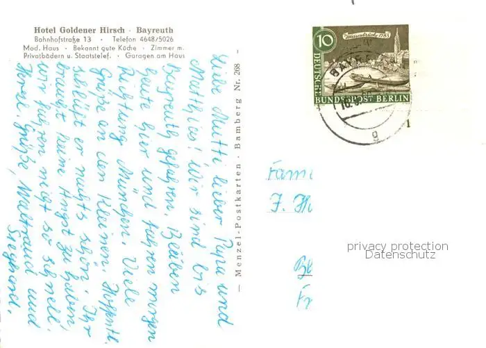 73854696 Bayreuth Hotel Goldener Hirsch Bayreuth postalisch gelaufen 1962 Erhaltung siehe scans [FriedD77] [Frierer ]