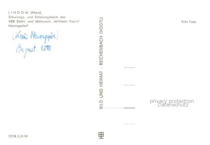 73854708 Lindow_Mark Schulungs- und Erholungsheim des VEB Stahl- und Walzwerk Wilhelm Florin Henningsdorf Lindow Mark postalisch nicht gelaufen nach 1965 Erhaltung siehe scans [FriedD77] [Frierer ]