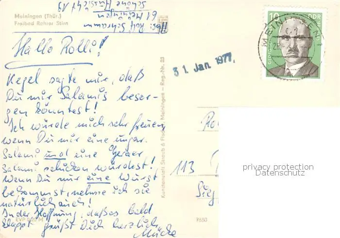 73855055 Meiningen_Thueringen Freibad Rohrer Stirn Meiningen Thueringen postalisch gelaufen 1977 Erhaltung siehe scans [FriedD77] [Frierer ]