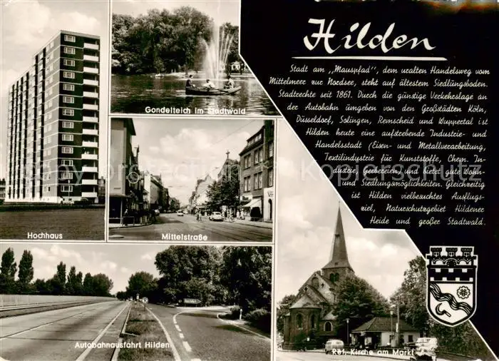 73855262 Hilden__Mettmann Hochhaus Gondelteich Stadtwald Mittelstrasse Kirche Autobahnausfahrt postalisch gelaufen 1966 Erhaltung siehe scans [FriedD77] [Frierer ]