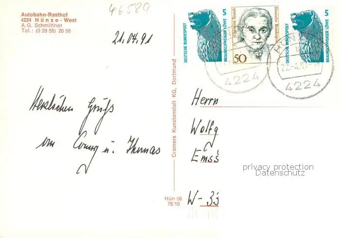 73855304 Huenxe Autobahn Rasthof Luftaufnahme Restaurant Huenxe postalisch gelaufen 1991 Erhaltung siehe scans [FriedD77] [Frierer ]