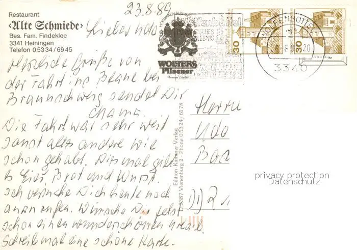 73857442 Heiningen_Wolfenbuettel Klosterhaehnchen Restaurant Alte Schmiede Speisesaal Jaegerzimmer Heiningen Wolfenbuettel postalisch gelaufen 1989 Erhaltung siehe scans [WerneD78] [WernPID7 ]