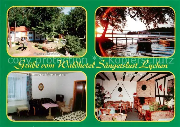 AK / Ansichtskarte 73857476 Lychen Waldhotel Saengerslust Gartenteich Bootssteg Zenssee Zimmer Montreux Jagdzimmer Lychen