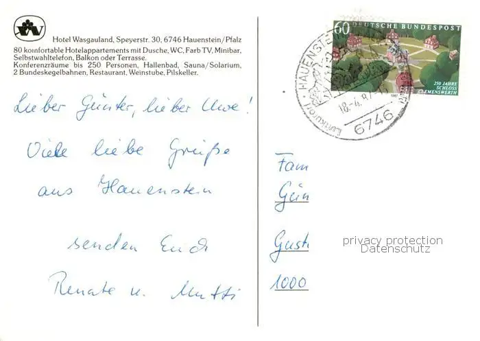 73857603 Hauenstein__Pfalz Hotel Wasgauland Gaststube Schlossblick Kegelbahn postalisch gelaufen 1987 Erhaltung siehe scans [WerneD78] [WernPID7 ]