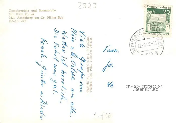 73857797 Ascheberg_Holstein Campingplatz und Strandhalle Fliegeraufnahme Ascheberg_Holstein postalisch gelaufen 1968 Erhaltung siehe scans [FriedD77] [Frierer ]