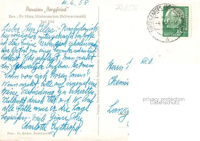 73857956 Hinterzarten Pension Bergfried im Schwarzwald Garten Hinterzarten postalisch gelaufen 1958 Erhaltung siehe scans [FriedD77] [Frierer ]