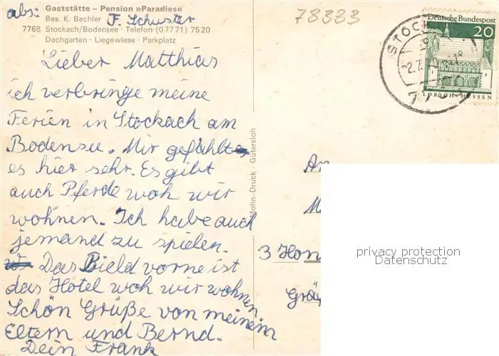 73858295 Stockach_Bodensee Gaststaette Pension Paradies Stockach Bodensee postalisch gelaufen 1970 Erhaltung siehe scans [FriedD77] [Frierer ]