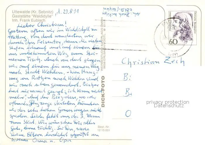 73858978 Uttewalde_Uttewalder_Grund Gaststaette Waldidylle postalisch gelaufen 1991 Erhaltung siehe scans [WerneD78] [WernPID7 ]
