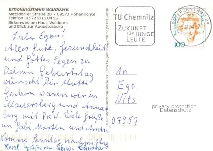 73860035 Hohenfichte Erholungsheim Waldpark Birkenweg Augustusburgblick Hohenfichte postalisch gelaufen 2004 Erhaltung siehe scans [WerneD78] [WernPID7 ]