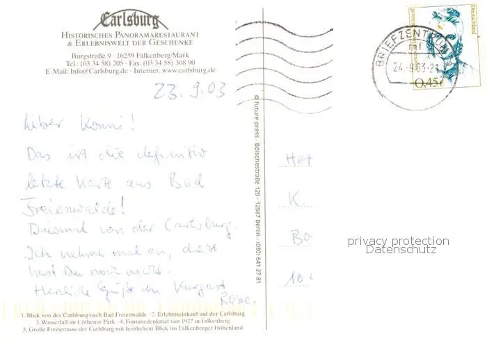 73860282 Falkenberg_Mark Carlsburg Historisches Panoramarestaurant und Erlebniswelt der Geschenke Details Falkenberg Mark postalisch gelaufen 2003 Erhaltung siehe scans [WerneD78] [WernPID7 ]