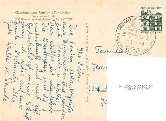 73862657 Heimbuchenthal Gasthaus Pension Zur Linde Heimbuchenthal postalisch gelaufen 1955 Erhaltung siehe scans [WerneD78] [WernPID7 ]