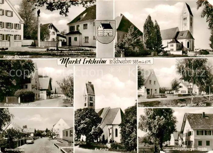 AK / Ansichtskarte 73862659 Erkheim Krieger Ehrenmal Kath Kirche Gasthaus Zum Anker Gartenstr Ev Kirche Partie an der Guenz Schlegersberger Strasse Erkheim