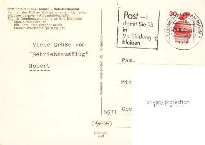 73863185 Weidenthal_Pfalz Forellenhaus Isenach Cafe Restaurant Weidenthal Pfalz postalisch gelaufen 1973 Erhaltung siehe scans [WerneD78] [WernPID7 ]