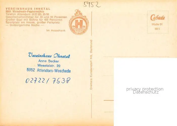 73863515 Weschede_Attendorn Vereinshaus Ihnetal Gastraeume postalisch nicht gelaufen nach 1965 Erhaltung siehe scans [WerneD78] [WernPID7 ]