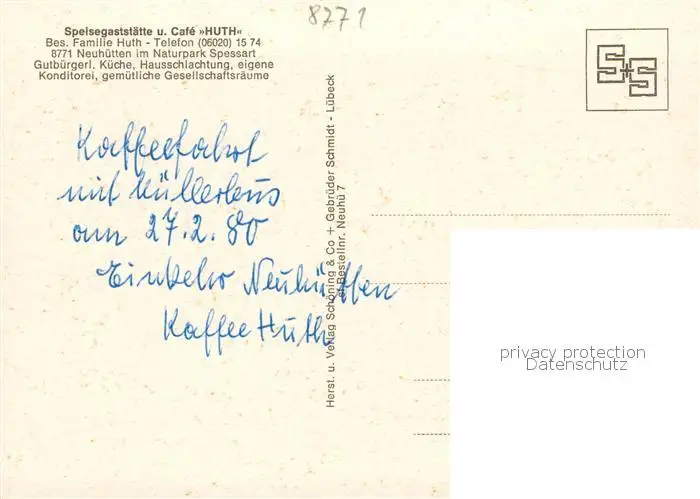 73864513 Neuhuetten_Unterfranken Gasthaus Cafe Huth Gastraeume Neuhuetten Unterfranken postalisch nicht gelaufen 1980 Erhaltung siehe scans [WerneD78] [WernPID7 ]
