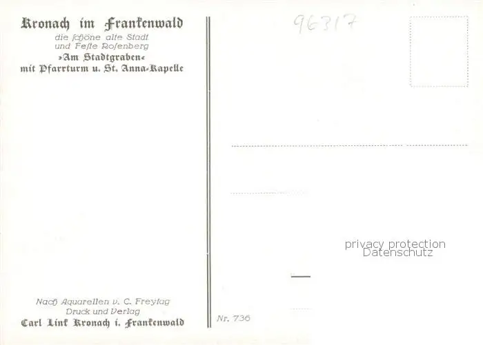 73864855 Kronach_Oberfranken Am Stadtgraben mit Pfarrturm und St. Anna Kapelle nach Aquarell von C. Feytag Kuenstlerkarte Kronach Oberfranken postalisch nicht gelaufen nach 1965 Erhaltung siehe scans [FriedD77] [Frierer ]