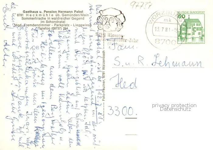 73865261 Heckmuehle_Gemuenden_Schondratal_Bayern Teilansicht mit Gasthaus Pension Pabst postalisch gelaufen 1981 Erhaltung siehe scans [FriedD77] [Frierer ]
