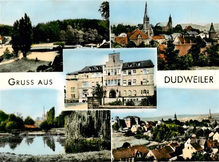 73865316 Dudweiler_Saarbruecken Ortsansicht mit Kirche Zentrum Teich postalisch gelaufen nach 1965 Erhaltung siehe scans [FriedD77] [Frierer ]