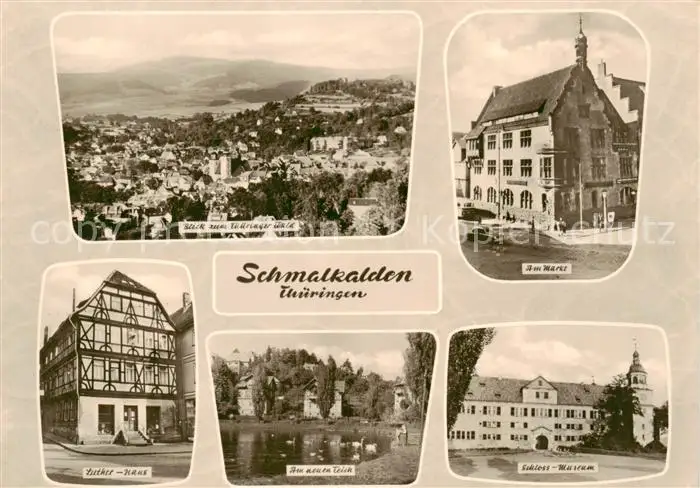 AK / Ansichtskarte 73867053 Schmalkalden Panorama Blick zum Thueringer Wald Markt Luther-Haus Teich Schloss Museum Schmalkalden