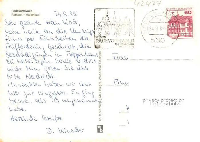73867167 Radevormwald Rathaus Hallenbad Radevormwald postalisch gelaufen 1985 Erhaltung siehe scans [FriedD77] [Frierer ]