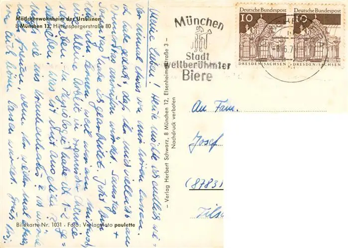 73869875 Muenchen Maedchenwohnheim der Ursulinen Muenchen postalisch gelaufen nach 1965 Erhaltung siehe scans [FriedD77] [Frierer ]