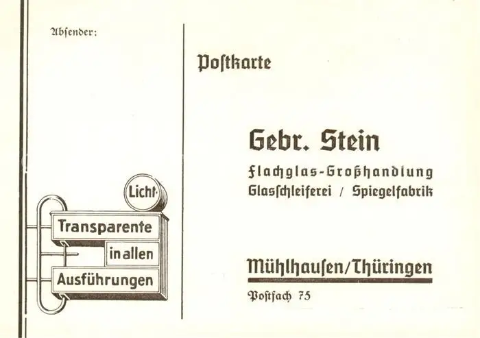 AK / Ansichtskarte 73870118 Muehlhausen__Thueringen Gebr Stein Flachglas Grosshandlung Bestellkarte