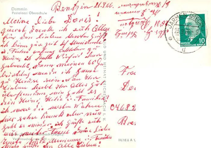 73871634 Demmin_Mecklenburg_Vorpommern Pestalozzi Oberschule Demmin_Mecklenburg postalisch gelaufen 1966 Erhaltung siehe scans [WerneD78] [WernPID7 ]