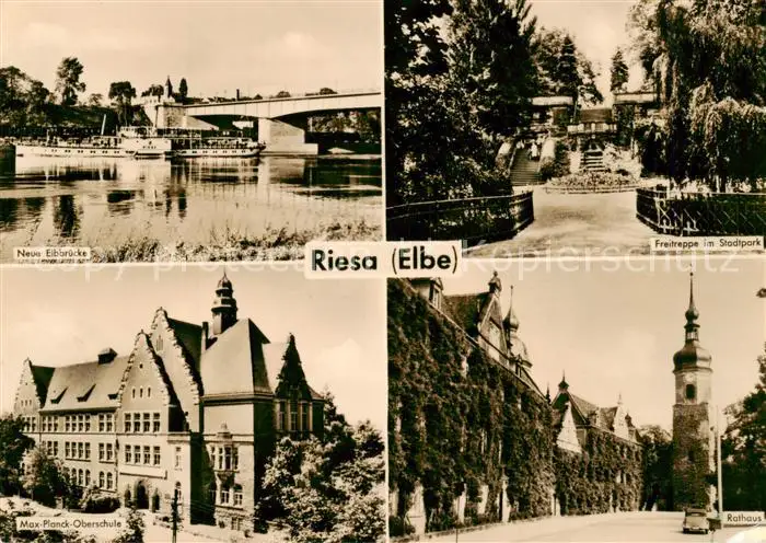 AK / Ansichtskarte 73873840 Riesa_Sachsen Neue Elbbruecke Freitreppe im Stadtpark Max Planck Oberschule Rathaus Riesa Sachsen