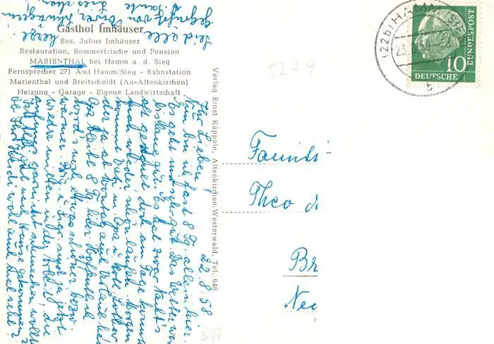 73876549 Hamm_Sieg Gasthof Imhaeuser Restauration Marienthal Hamm_Sieg postalisch gelaufen 1958 Erhaltung siehe scans [FriedD77] [Frierer ]