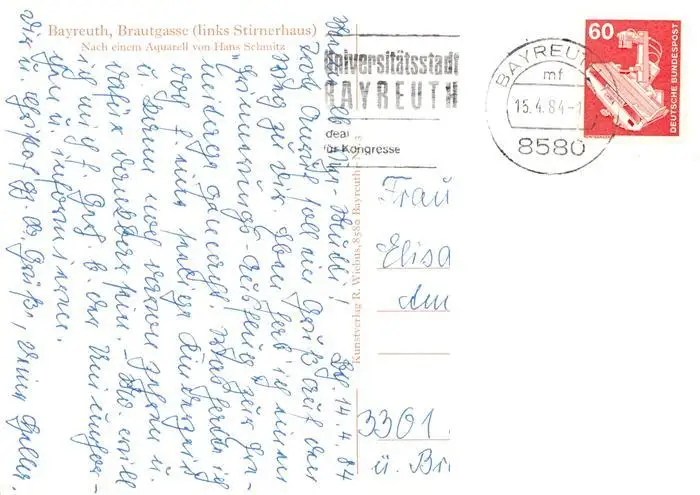 73877014 Bayreuth Brautgasse mit Stirnerhaus Aquarell Bayreuth postalisch gelaufen 1984 Erhaltung siehe scans [FriedD77] [Frierer ]