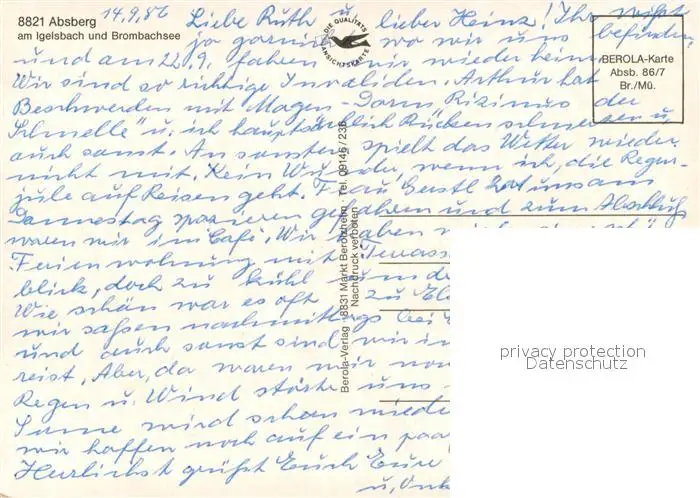 Absberg am Igelsbach und Brombachsee Segeln Windsurfen Kirche Schloss Strassenpartie Absberg postalisch nicht gelaufen 1986 Erhaltung siehe scans [FriedD77] Frierer