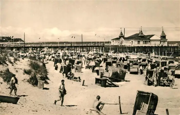 AK / Ansichtskarte Ahlbeck_Ostseebad Strand mit Seebr?cke Ahlbeck_Ostseebad