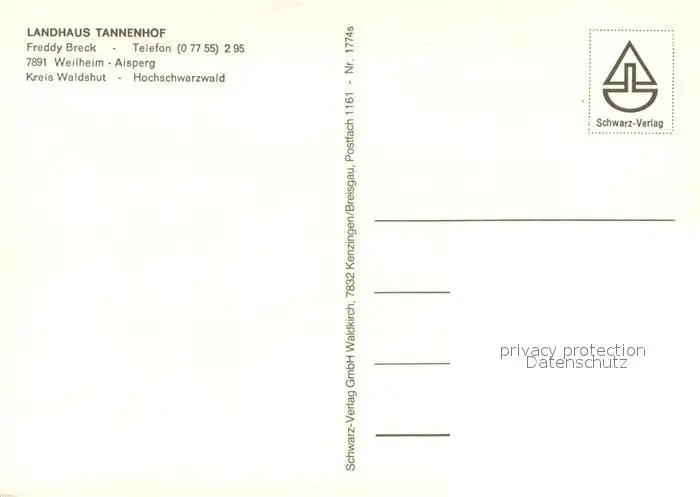 Aisperg_Weilheim Kategorie Alte Ansichtskarten Postkarten kr17126 Aisperg_Weilheim Landhaus Tannenhof im Schwarzwald postalisch nicht gelaufen nach 1965 Erhaltung siehe scans [FriedD77]
