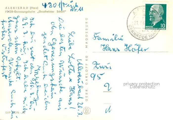 Alexisbad_Harz FDGB Genesungsheim Geschwister Scholl Alexisbad_Harz postalisch gelaufen 1921-1965 Erhaltung siehe scans [FriedD77] Frierer