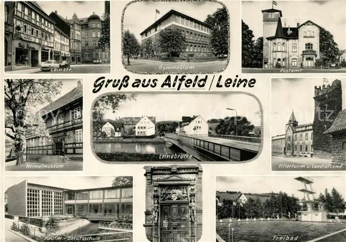 AK / Ansichtskarte Alfeld_Leine Leinstrasse Gymnasium Postamt Heimatmuseum Leinebruecke Fillerturm Freibad Kaufm. Berufsschule Alfeld_Leine