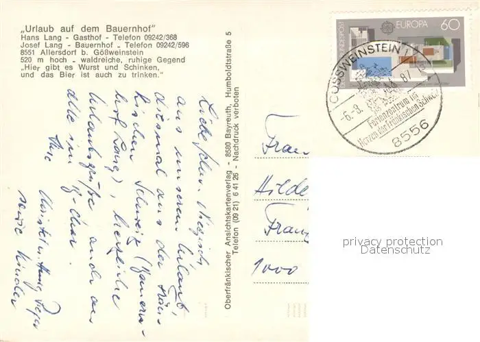 Allersdorf_Forchheim Dorfweiher Gasthof Wasserstein Urlaub auf dem Bauernhof Hansa-Linde Panorama Allersdorf_Forchheim postalisch gelaufen 1987 Erhaltung siehe scans [FriedD77] Frierer