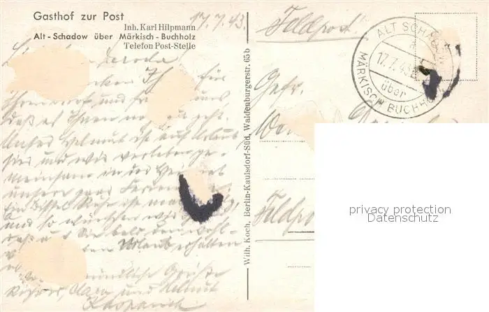 Alt-Schadow Uferpartie am See an Foersterei Tschinka Alt-Schadow postalisch gelaufen 1943 Feldpost Erhaltung siehe scans [FriedD77] Feldpost Frierer