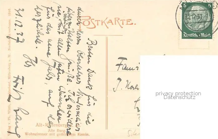 Alt_Miltenberg Alte Burg Wohnzimmer mit gothischem Kamin Alt_Miltenberg postalisch gelaufen 1937 Erhaltung siehe scans [FriedD77] Frierer