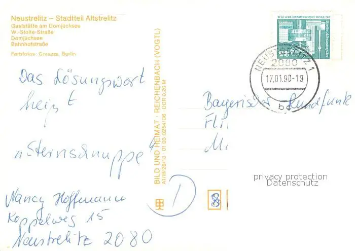 Alt_Strelitz Gaststaette am Domjuechsee Stolte Strasse Domjuechsee Bahnhofstrasse Alt_Strelitz postalisch gelaufen 1990 Erhaltung siehe scans [WerneD78] WernPID7