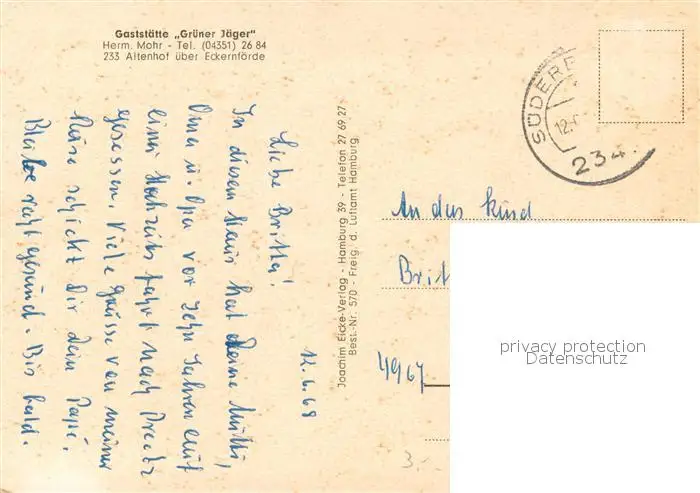 Altenhof_Eckernfoerde Gaststaette Gruener Jaeger Fliegeraufnahme Altenhof Eckernfoerde postalisch gelaufen 1968 Erhaltung siehe scans [FriedD77] Frierer