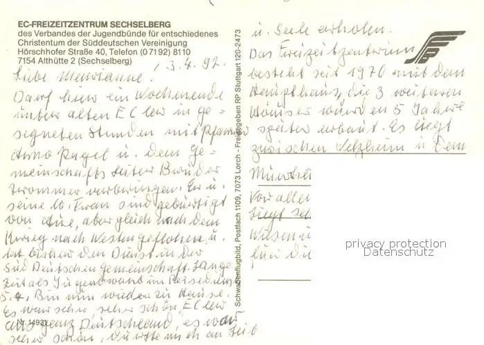 Althuette_Wuerttemberg EC Freizeitzentrum Sechselberg Fliegeraufnahme Althuette Wuerttemberg postalisch nicht gelaufen 1992 Erhaltung siehe scans [WerneD78] WernPID7