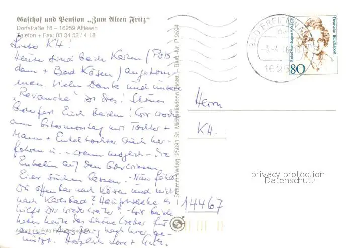 Altlewin Gasthof Pension Zum alten Fritz Altlewin postalisch gelaufen 1996 Erhaltung siehe scans [FriedD77] Frierer
