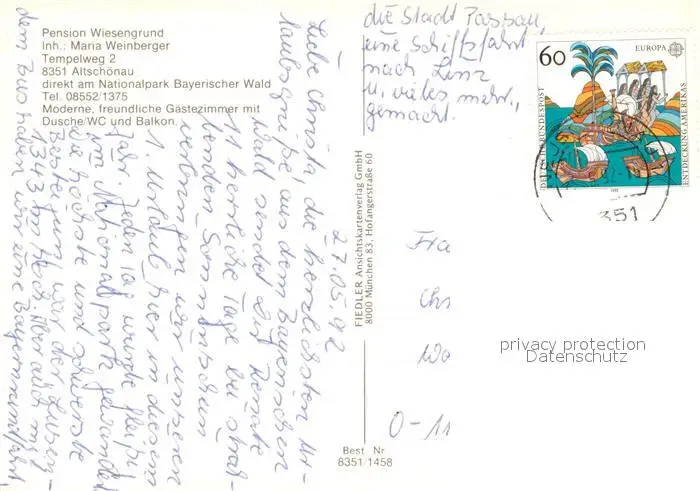 Altschoenau Pension Wiesengrund am Nationalpark Bayerischer Wald Altschoenau postalisch gelaufen 1992 Erhaltung siehe scans [FriedD77] Frierer