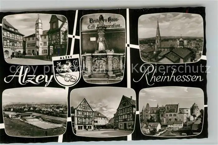 Alzey Altstadt Fachwerkhaeuser Voelkerbrunnen Kirche Schloss Freibad Bromsilber Alzey postalisch nicht gelaufen 1921-1965 Erhaltung siehe scans [FriedD77] Frierer
